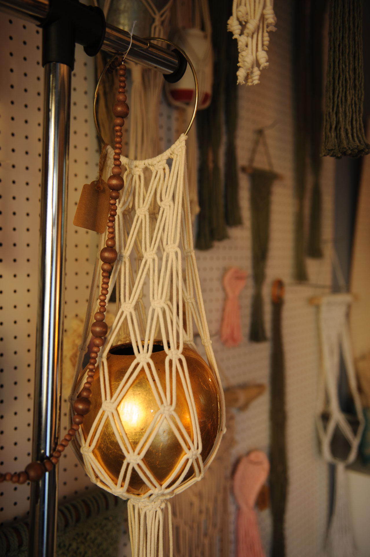 White macrame plant hanger on large metal ring.